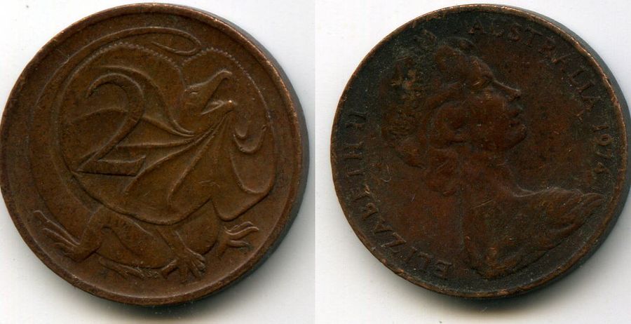 Страна эмитент: Австралия Год чеканки: 1974 Материал: сплав Состояние: как на скане Описание: ящерица, Елизавета II второй портрет