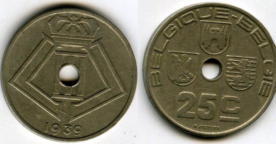 Страна эмитент: Бельгия Год чеканки: 1939 Материал: никель Состояние: как на скане Описание: три шита, надпись на 2-х языках, первый французский