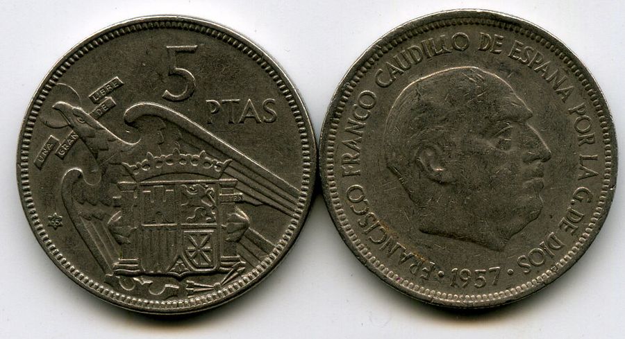 Страна эмитент: Испания Год чеканки: 1965г, серия 1957 Материал: сплав Состояние: как на скане Описание: профиль Франко, орёл с гербом