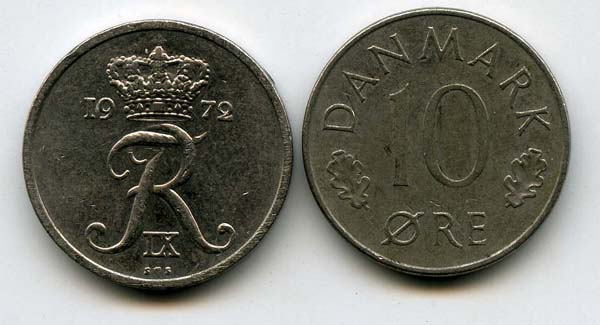 Страна эмитент: Дания Год чеканки: 1972 Материал: медно-никелевый сплав Состояние: как на скане Описание: корона и вензель короля, дубовая и лавровая ветви