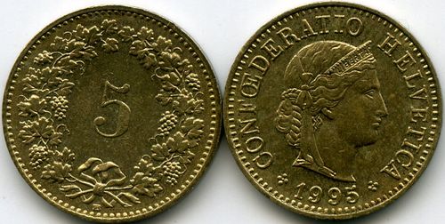 Монета 5 раппен 1995г Швейцария 30 руб.