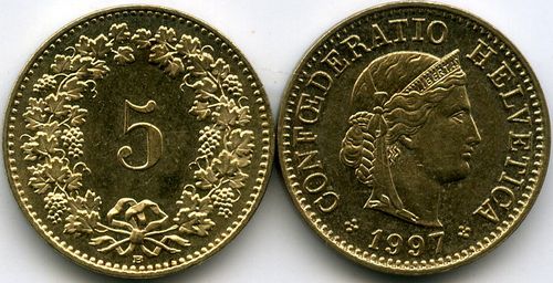 Страна эмитент: Швейцарская Конфедерация Год чеканки: 1997 Материал: медно-никелевый сплав Состояние: как на скане Описание: две лавровые ветви, профиль девушки