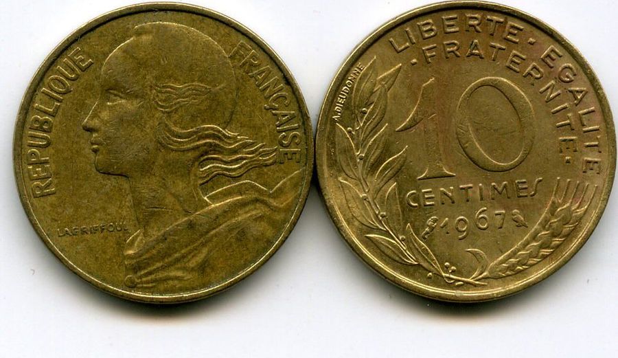 Монета 10 сентимов 1967г Франция