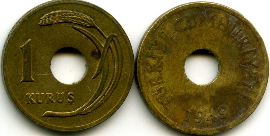 Страна эмитент: Турция Год чеканки: 1949 Материал: сплав, монета с отверстием Состояние: как на скане Описание: колос пшеницы