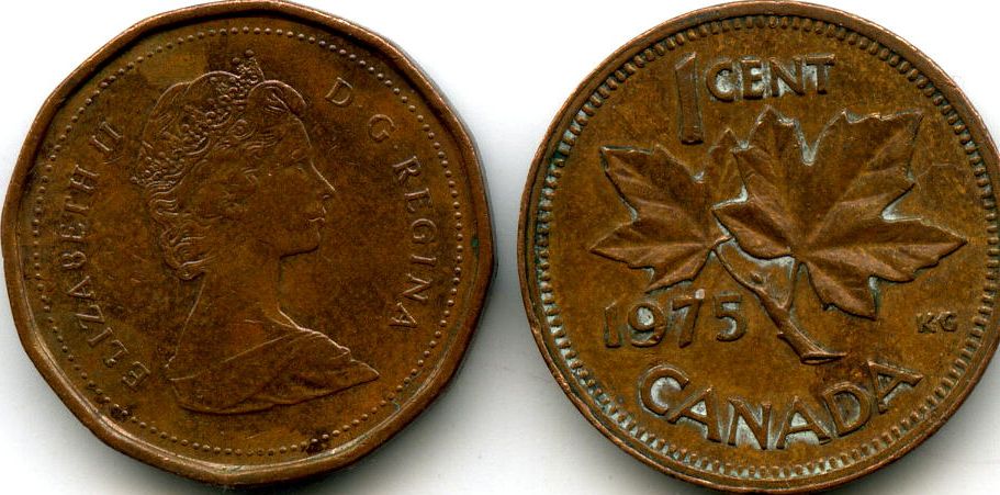 Страна эмитент: Канада Год чеканки: 1975 Материал: сплав Состояние: как на скане Описание: 2 кленовых листа, профиль королевы(второй портрет)