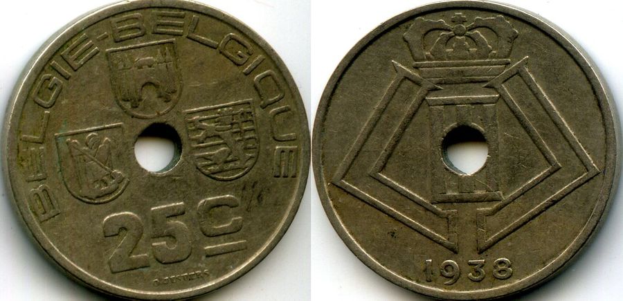 Страна эмитент: Бельгия Год чеканки: 1938, на фламанском языке, соотношение аверса/реверса монетное Материал: никелевая латунь, монета с отверстием Состояние: как на скане Описание: корона и вензель, ветвь оливы