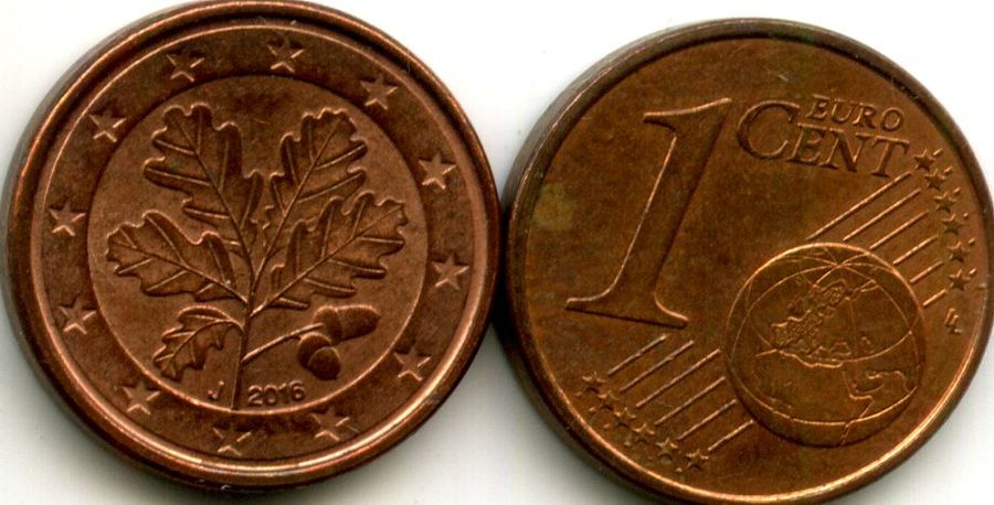 Монета 1 евроцент 2016г J Германия 15 руб.