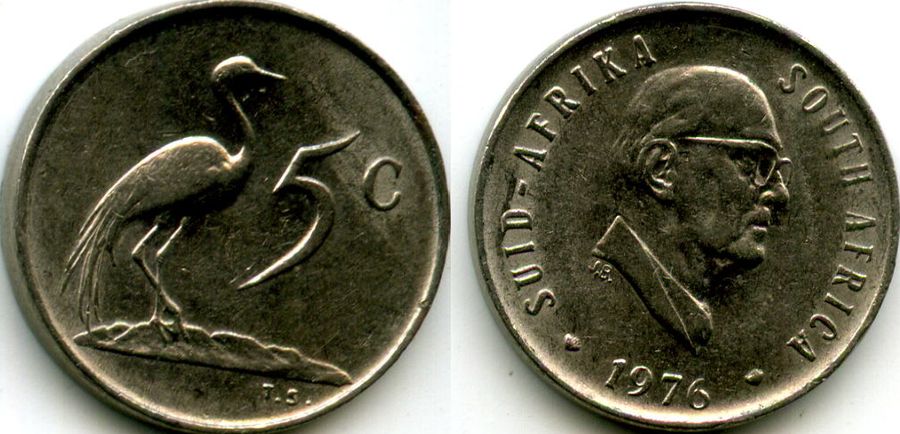 Страна эмитент: Южно-Африканская Республика Год чеканки: 1976 Материал: сплав Состояние: как на скане Описание: капские воробьи, окончание президентства Якобуса Йоханнеса Фуше