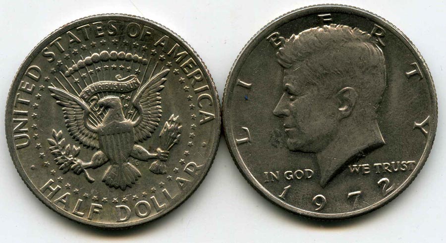 Страна эмитент: США Год чеканки: 1972 Материал: медно-никель сплав, вес пропорционален в 2 раза меньше 1 доллара Состояние: как на скане Описание: профиль 35 президента США Джона Кеннеди, герб США - орёл