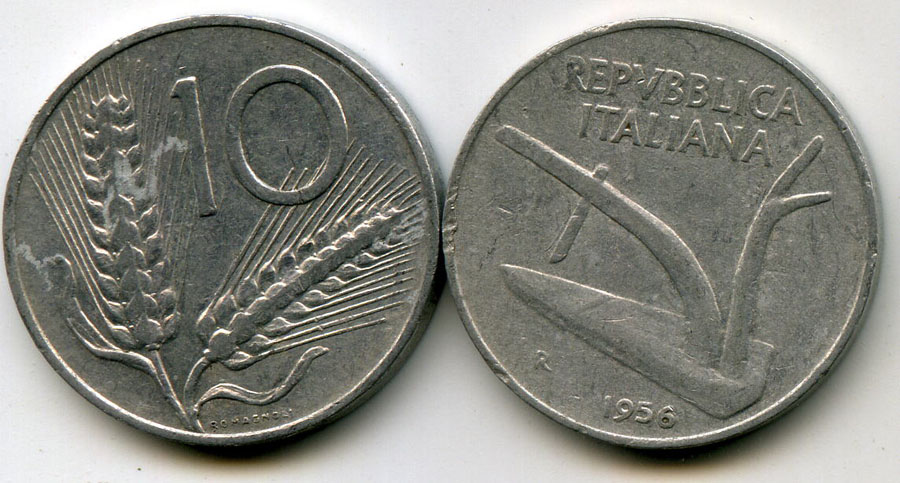 Страна эмитент: Италия Год чеканки: 1956 Материал: алюминий Состояние: как на скане Описание: колос пшеницы, плуг