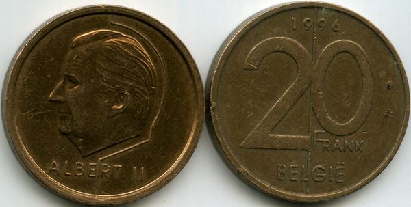 Страна эмитент: Бельгия Год чеканки: 1996, надпись на фламандском языке Материал: сплав Состояние: как на скане Описание: лев, корона, профиль короля Альберта 2