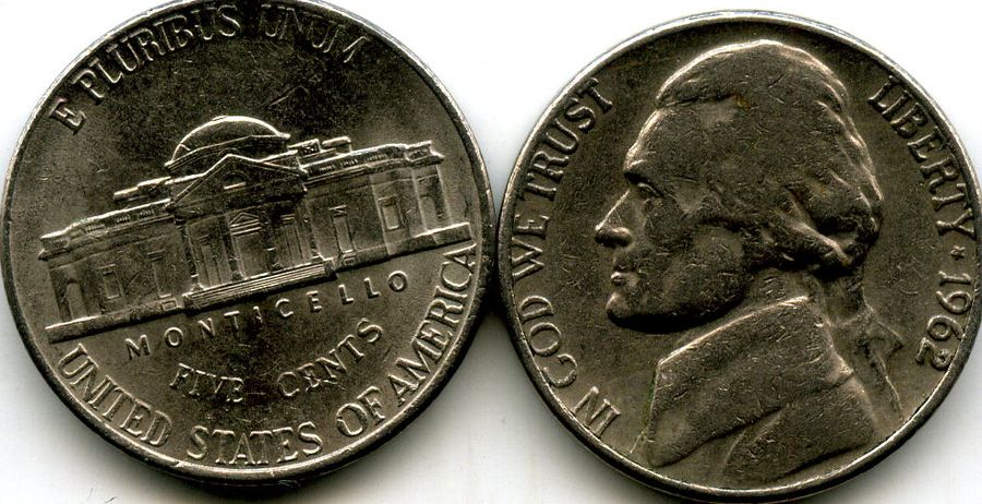 Страна эмитент: США Год чеканки: 1962, монетный двор D Денвер Материал: медно-никелевый сплав Состояние: как на скане Описание: профиль Джефферсона, изображение его усадьбы в Монтичело