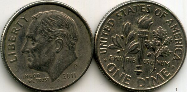Страна эмитент: США Год чеканки: 2011, монетный двор Р Материал: медь с медно-никелевый покрытием Состояние: как на скане Описание: факел, ветви дуба и оливы, профиль Рузвельта