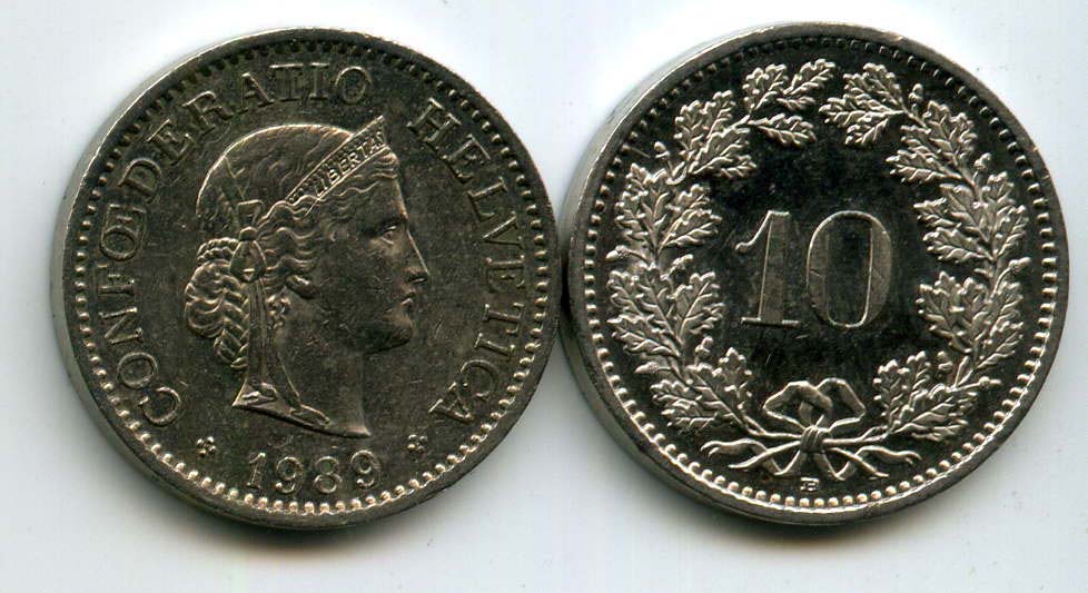 Монета 10 раппен 1989г Швейцария 35 руб.