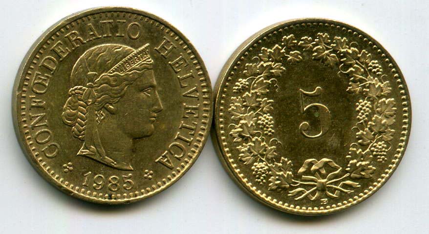 Страна эмитент: Швейцарская Конфедерация Год чеканки: 1985 Материал: медно-никелевый сплав Состояние: как на скане Описание: две лавровые ветви, профиль девушки