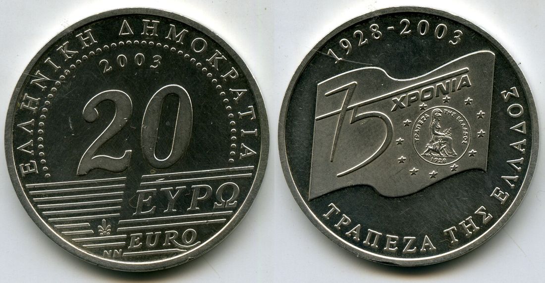 Монета 20 евро 2003г 75лет банку Греция 4,950 руб.