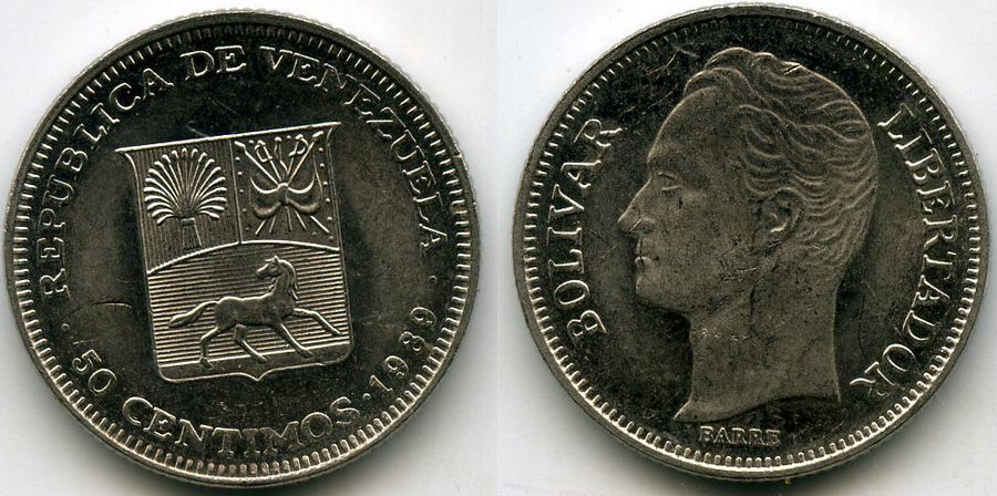 Страна эмитент: Венесуэла Год чеканки: 1989 Материал: сталь с никелевым покрытием Состояние: как на скане Описание: герб страны, портрет освободителя Боливара