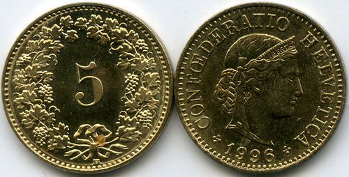 Монета 5 раппен 1996г Швейцария 30 руб.