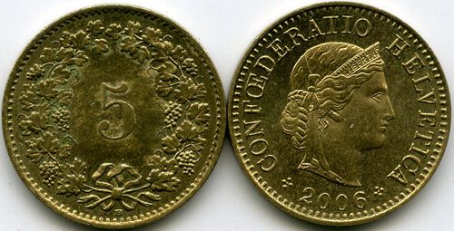 Страна эмитент: Швейцарская Конфедерация Год чеканки: 2006 Материал: медно-никелевый сплав Состояние: как на скане Описание: две лавровые ветви, профиль девушки
